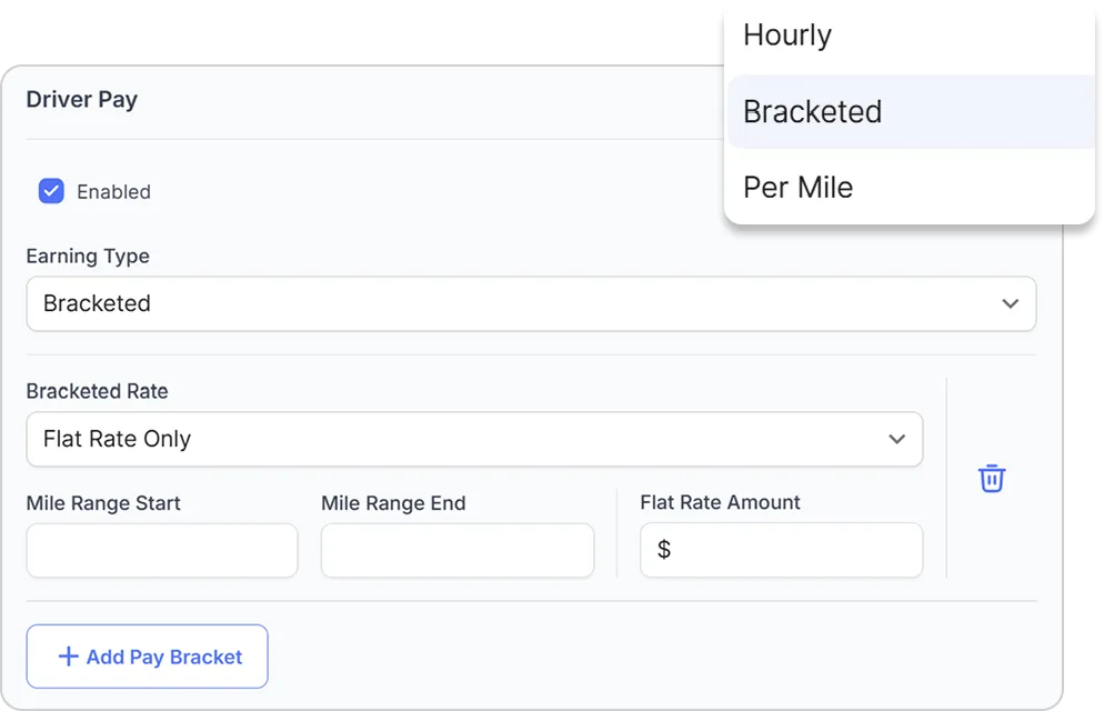 Per diem payments can be configured as flat amounts or bracketed by distance from home, with options to adjust when lodging is provided by the company, ensuring fair compensation for subsistence expenses.