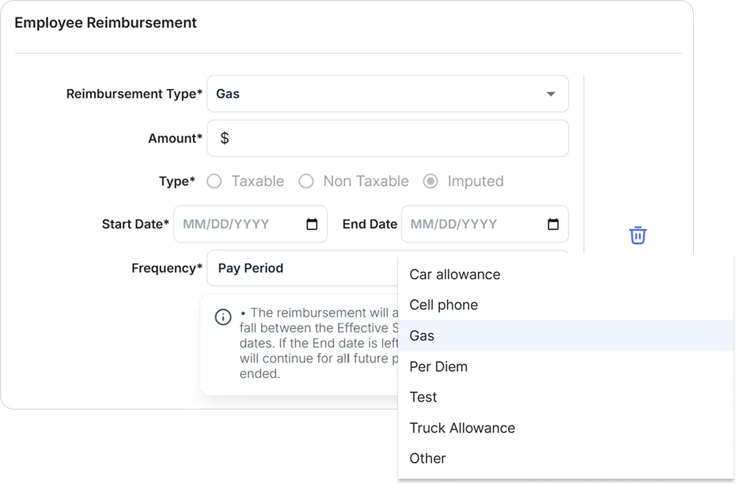 Reimbursements can be created at the company level for bulk application or assigned individually, with options to set frequency and expiry. These reimbursements automatically appear in payroll drafts and employee earnings statements.